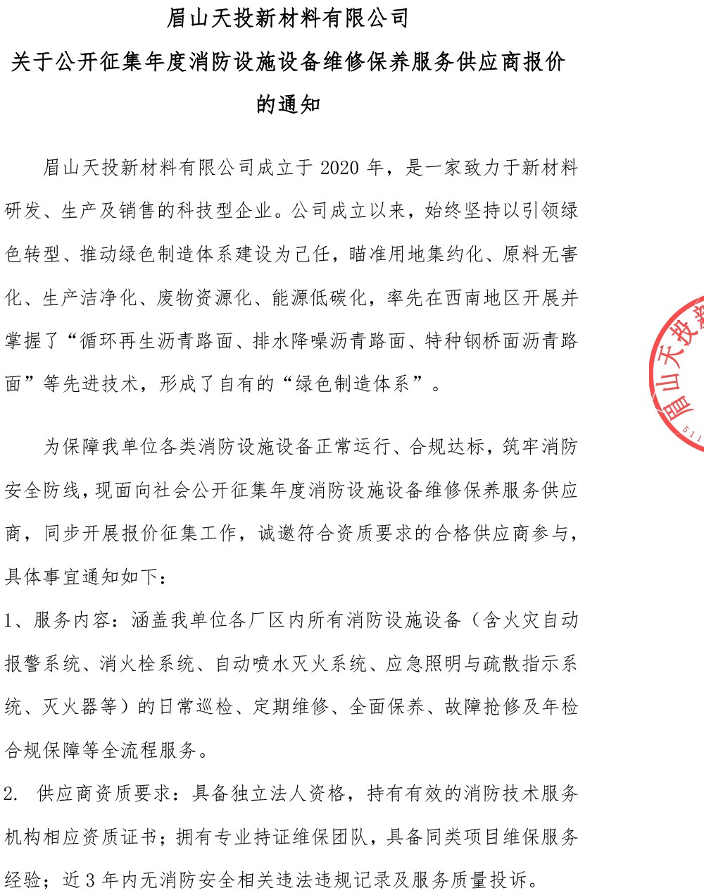 眉山天投新材料有限公司關(guān)于公開征集年度消防設(shè)施設(shè)備維修保養(yǎng)服務(wù)供應(yīng)商報價的通知